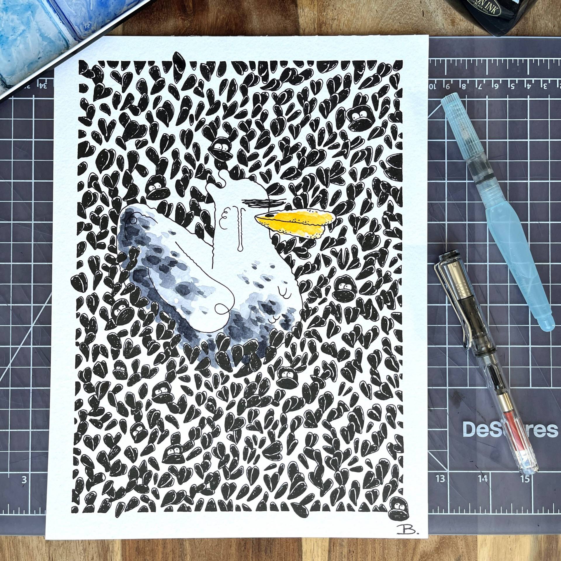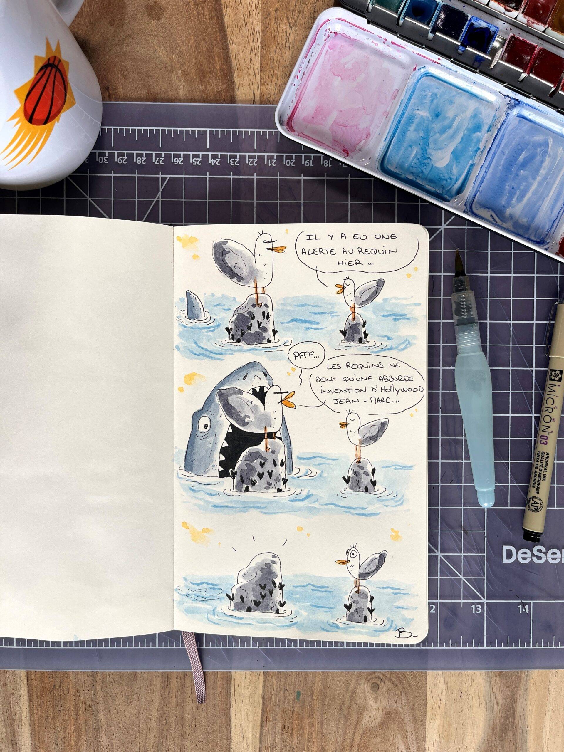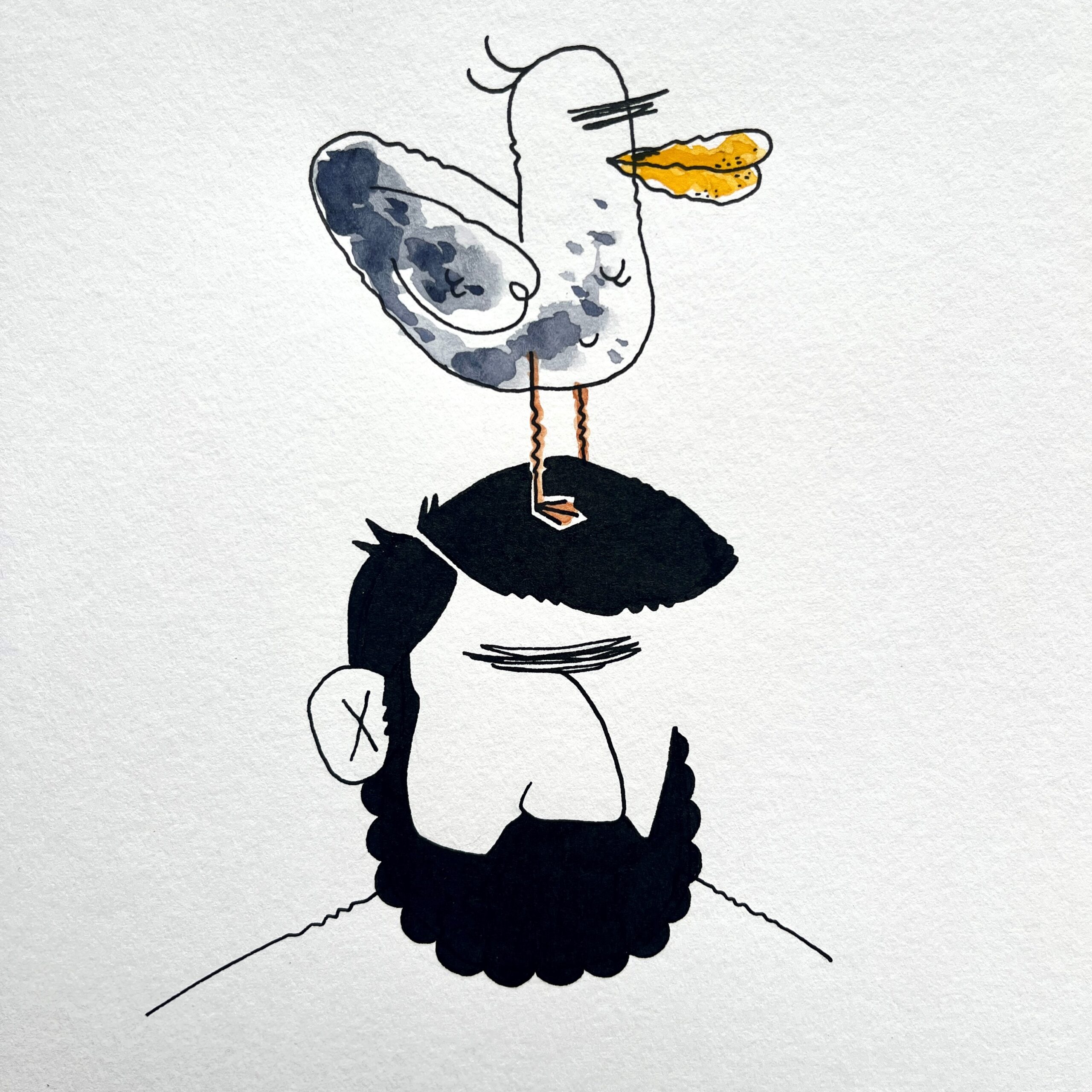 Orlando Busso is an illustrator based in Montreal, Quebec. As a former tattoo artist, he has always enjoyed drawing. But after several years working as a Prop Master for the French television and as a gunsmith in the film industry, he decided to switch to illustration. As an avid reader of comic strips, he loves inventing characters and bringing them to life. His favorite one is The Seagull, whom he enjoys depicting in funny strips inspired by everyday life. His mediums? Sketchbooks, black ink and watercolor!
