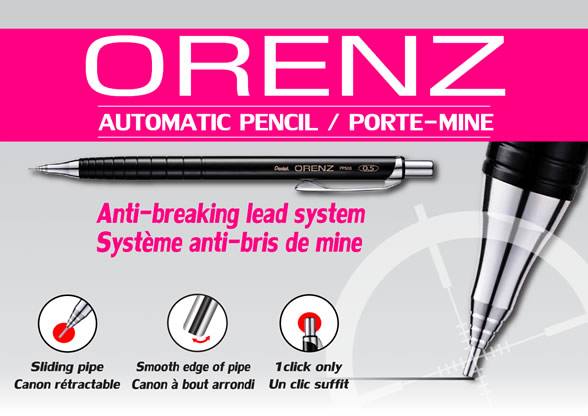 ORENZ is the mechanical pencil with “Anti-Breaking lead system”. Thanks to the innovative system, your pencil lead will not break when writing. The secret of the mechanism is guide pipe. The guide pipe protects the entire length of the lead which enables you to write without extending the lead out of the guide pipe. As