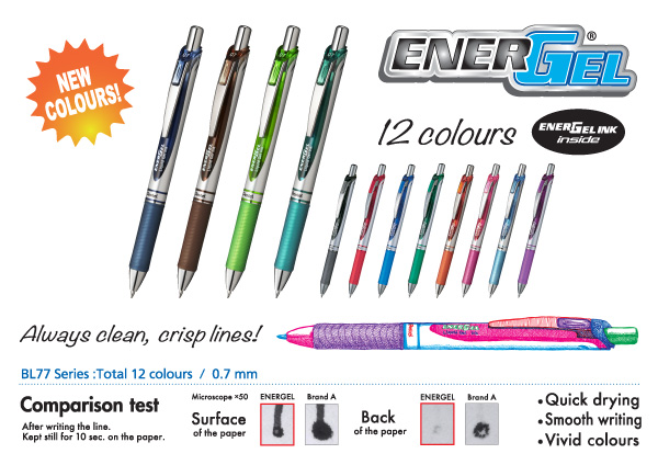 New colours to the popular EnerGel line! Rich and vivid colours. Quick dry gel ink. Great for Lefties! -BL77-CA Navy Blue, BL77-E Brown, BL77-K Lime Green, BL77-S3 Turquoise Blue Nouvelle couleurs de la populair collection EnerGel! Couleurs riches et vives. Nouvelle encre gel liquide séchage rapide. Idéal pour les gauchers! -BL77-CA Bleu marine, BL77-E Marron,