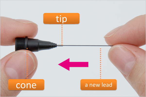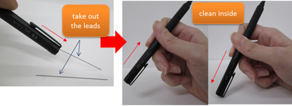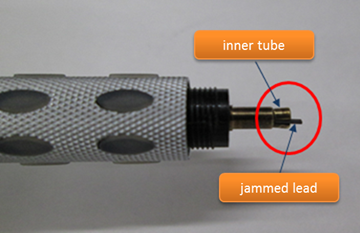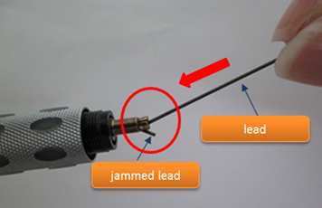 2. Please use Pentel lead 0.3mm. Insert a lead from the tip to push out the jammed lead