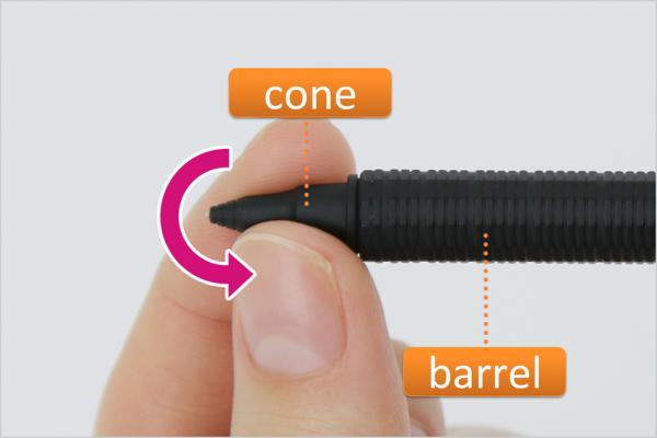 2. Push the tip into the pencil and twist the cone and separate it from the barrel