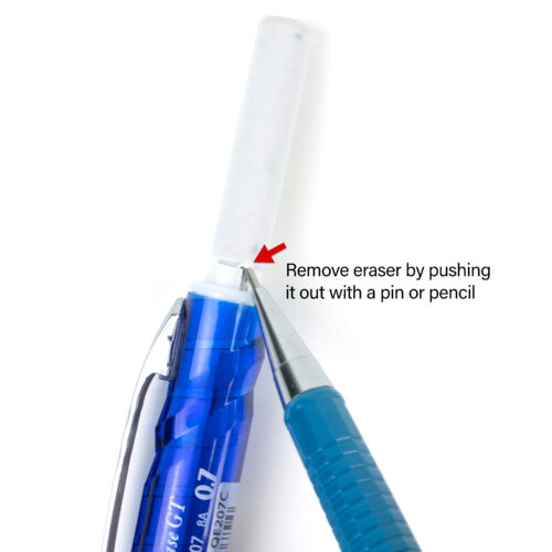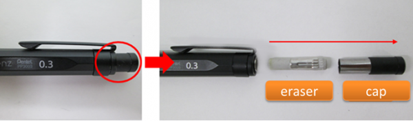 *Please put both eraser and cap back to the pencil before testing the lead to come out. If you put only the eraser back into the barrel, it could stuck inside.