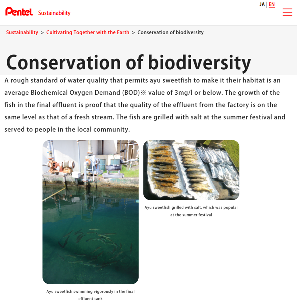 Since 1964, Pentel Ibaraki Factory has been dedicated to preserving the water environment of local rivers and lakes in the area. Efforts to purify effluent and protect the lake showed remarkable results. In 2008, we upgraded our effluent purification facility and created a biotope for fireflies, now emerging every year. In 2011, we started rearing ayu sweetfish, thriving in our purified water. As part of our commitment to the community, we serve these grilled sweetfish at our annual summer festival. At Ibaraki Factory, we take pride in our contributions to environmental conservation.