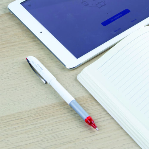 This is a very good pen. This is one of the very few pens that writes as if it is gliding across the paper. Also unlike other roller-ball pens, this has a rubber grip. However, I wish that it comes in 0.5 mm or at the very least 0.7 mm sizes. The 0.8 mm tip left lines that were just too big, making some of the writing illegible.