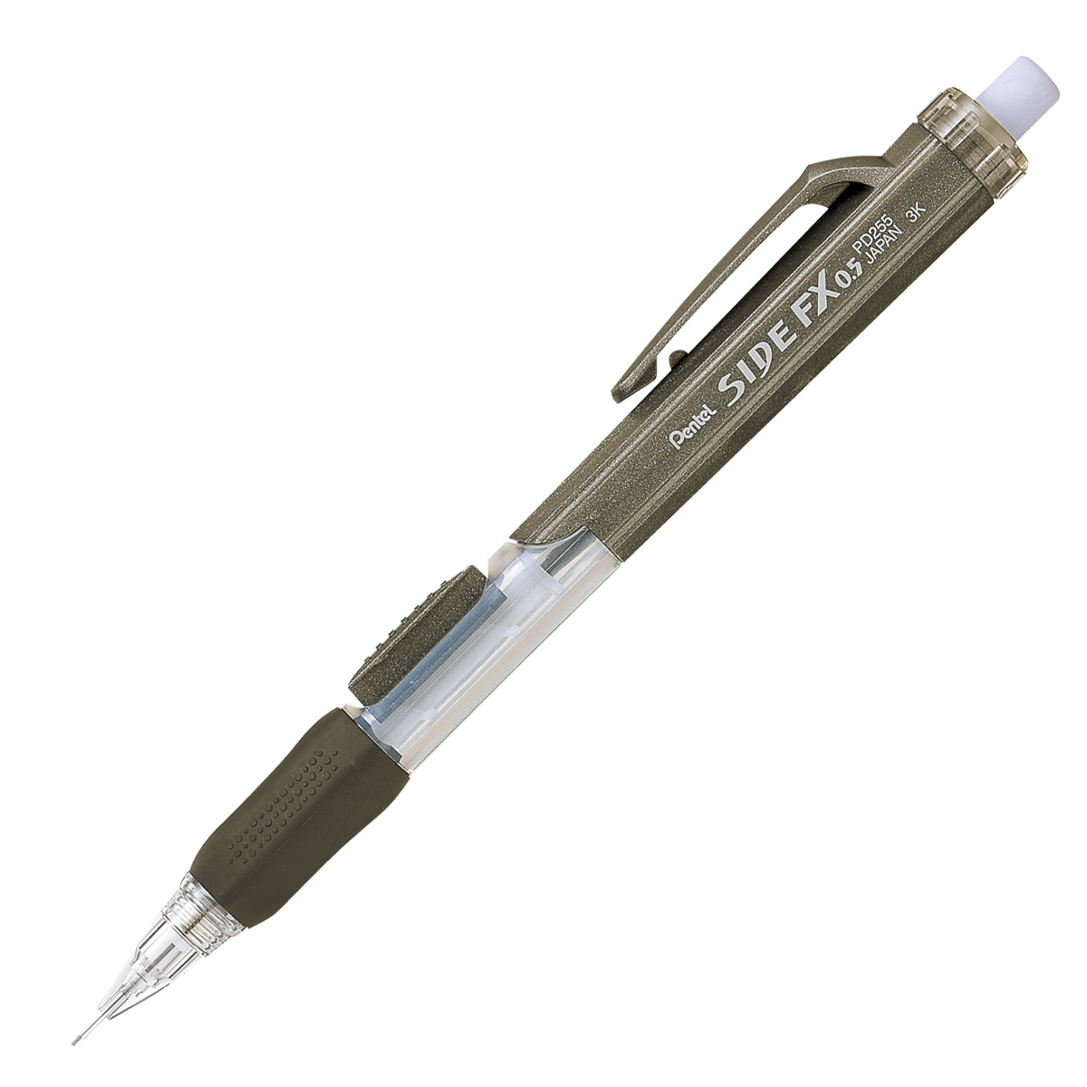 Useful large retractable eraser is larger than ordinary pencil erasers. Convenient side button advances lead without the need to change writing position. Innovative hexagonal-shaped design is easy to grasp. Finger-moulded rubber grip provides hours of comfortable use. Uses 0.5mm lead and E10 refill eraser.
