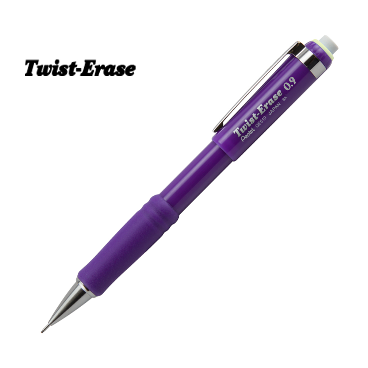 New line in “Twist-Erase” series. Large retractable eraser and metal clip. Soft rubber grip provides hours of comfortable writing. Uses 0.9mm lead and E10 refill eraser. 3mm fixed sleeve.
