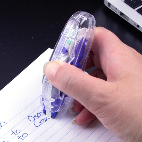 Ruban de correction avec une mini tête de rouleau avancée. Ruban de 20 mètres de long chargé. Le ruban se coupe proprement et adhere parfaitement. Tirez le commutateur à glissière vers l’arrière pour ranger la tête du correcteur à l’intérieur du boîtier.
